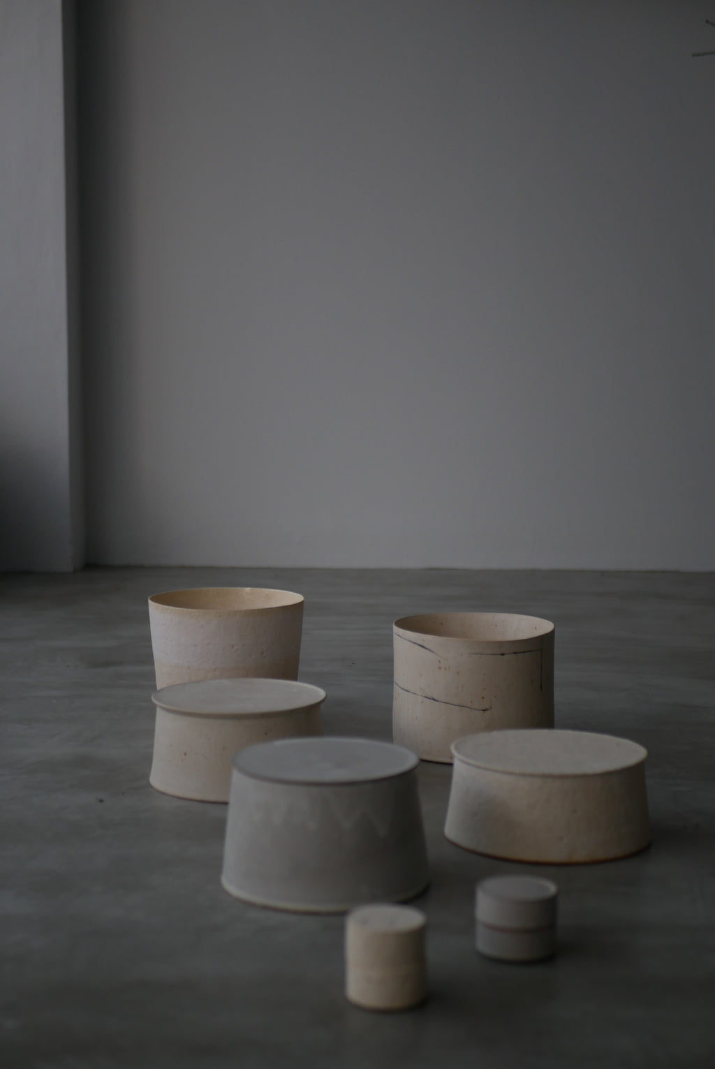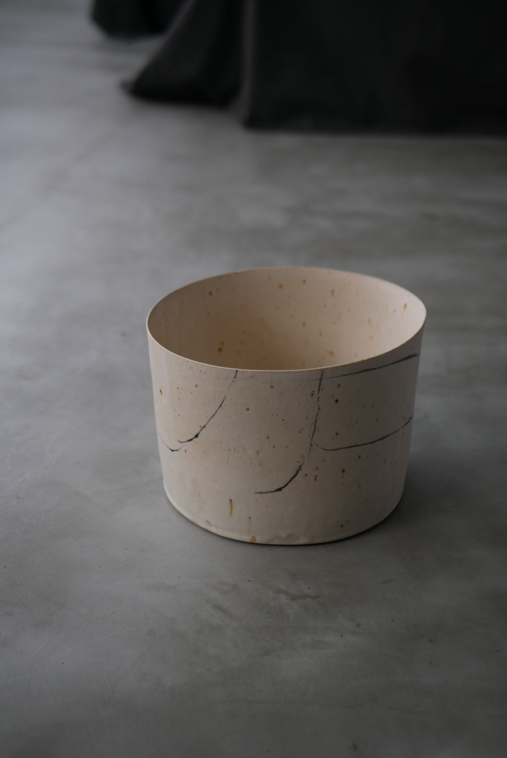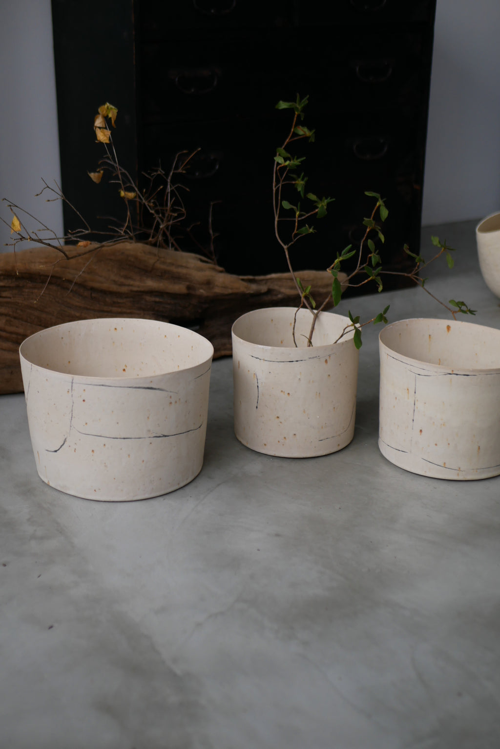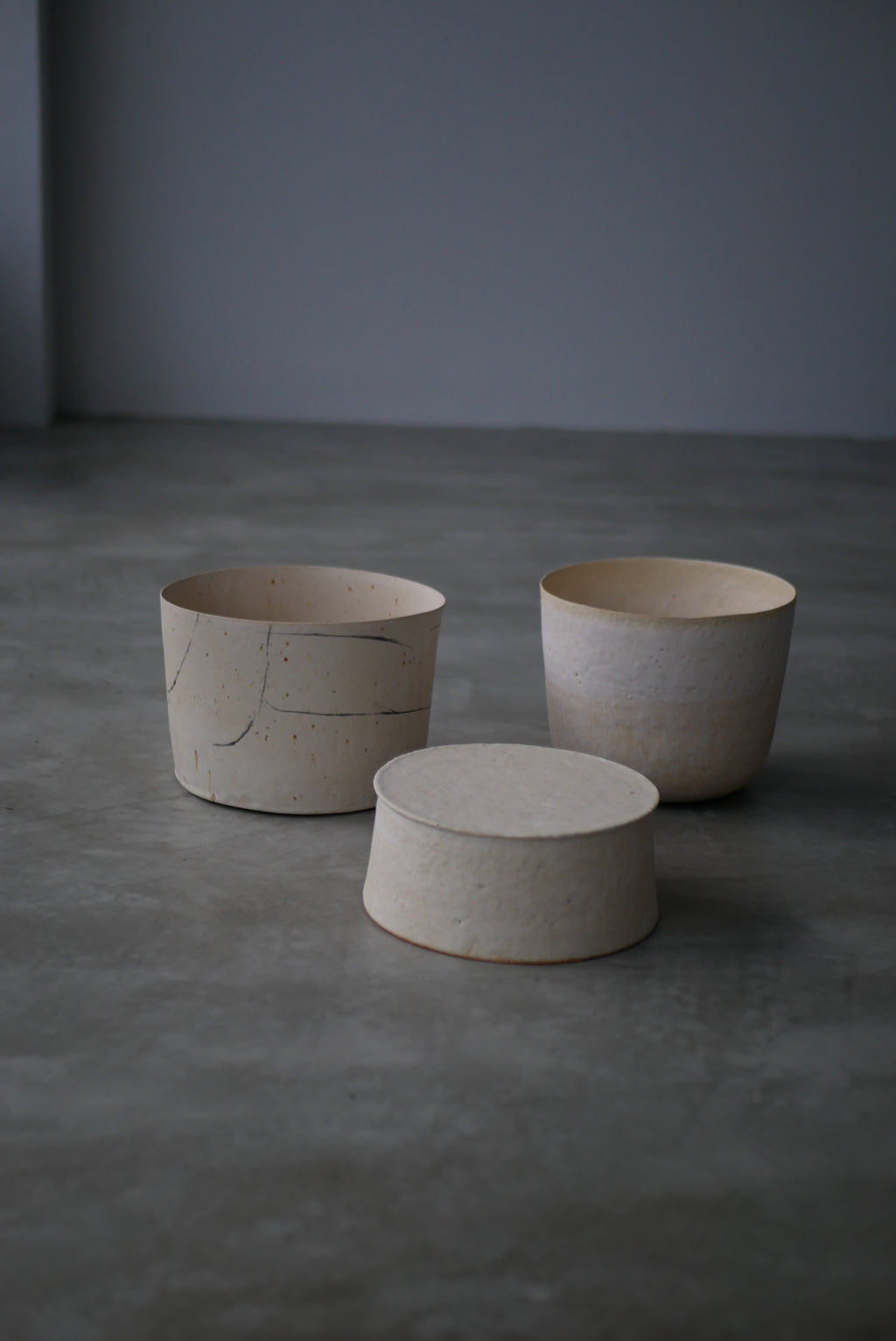 土の肌を半透明の Veil から透かして魅せるAkari  Sato を代表するシリーズ。土の鉄分による模様を楽焼き Veil から透かした土肌、素土の表情や鉄分の景色に呼応して線を描くドローイング、石粒入った土をあえて用いた月面のような石肌。どれもアート性の高い質感表現でありながら余白があり、花も食物も映える。
