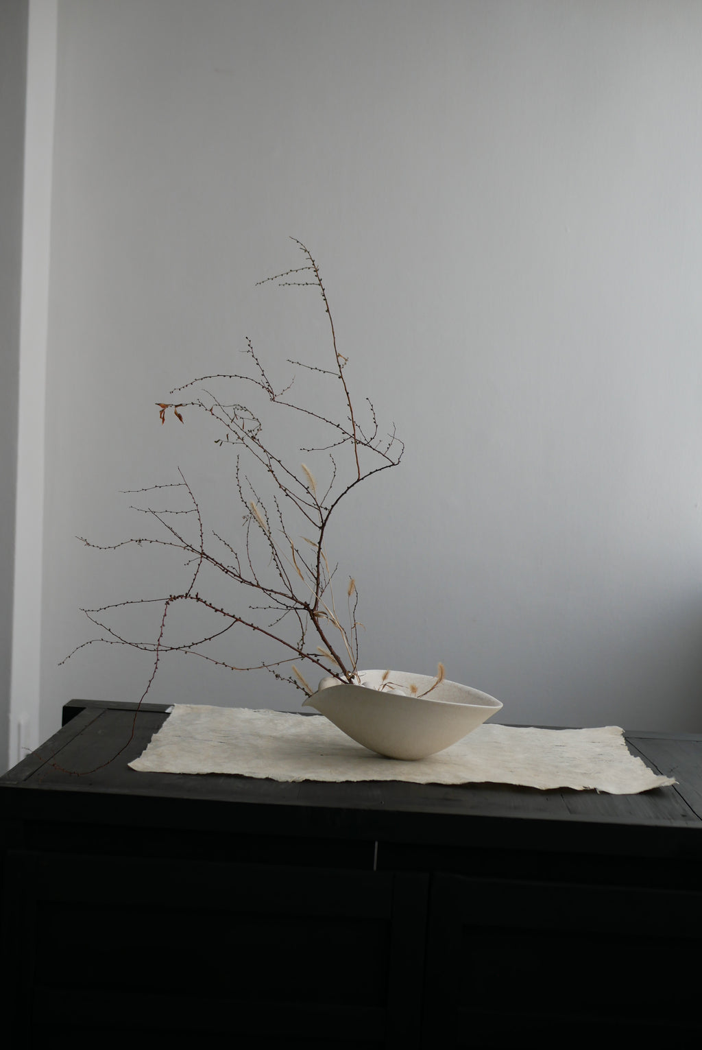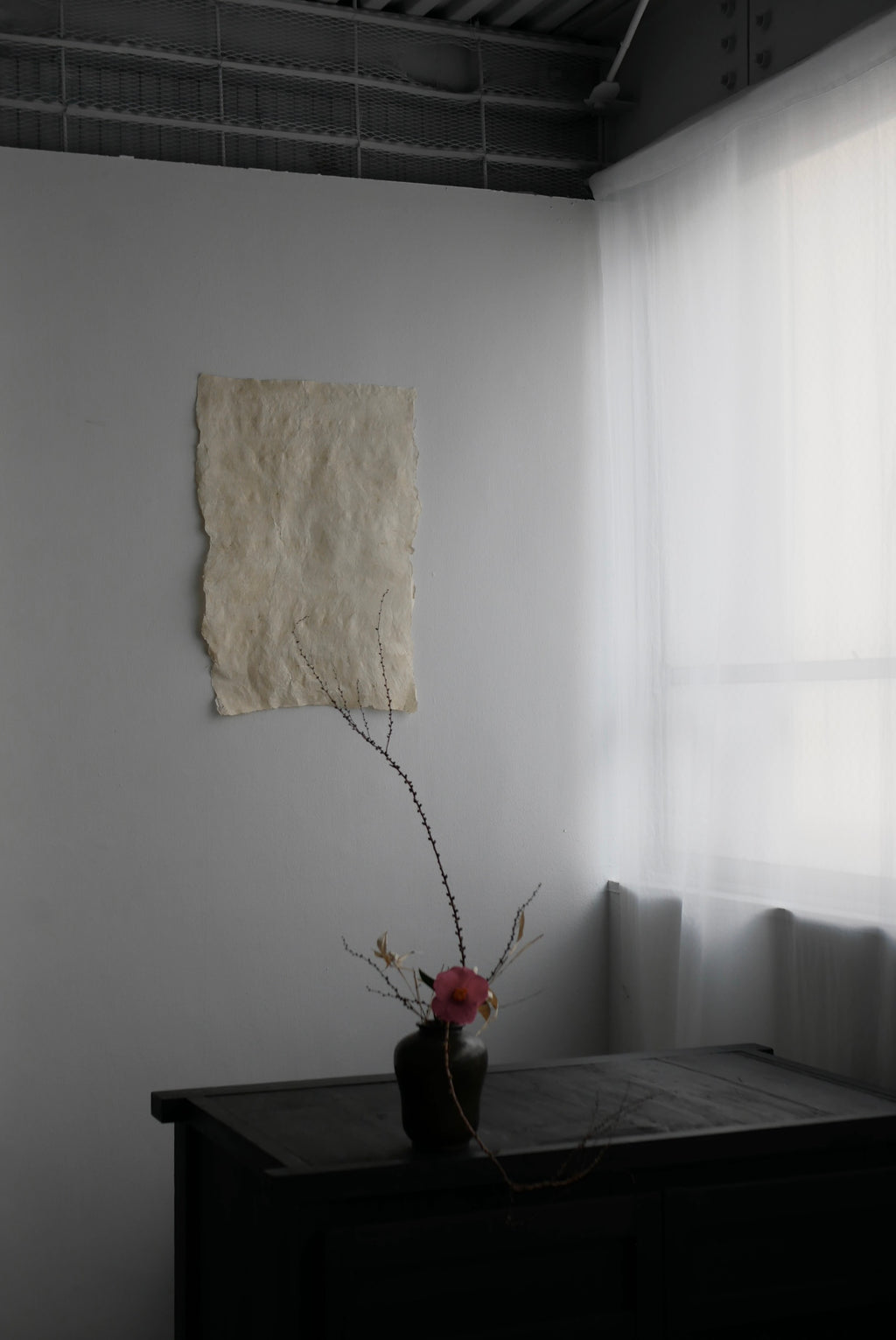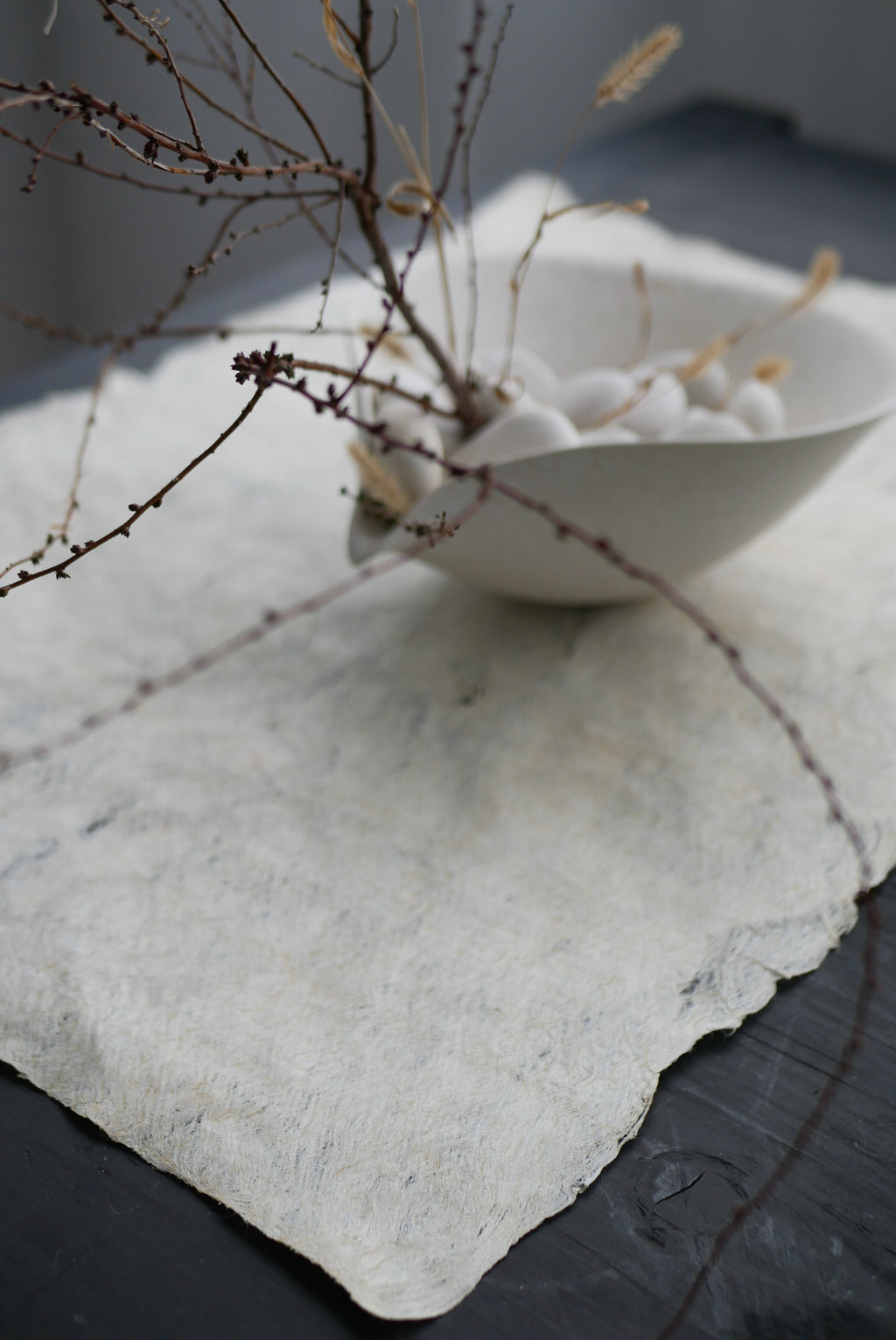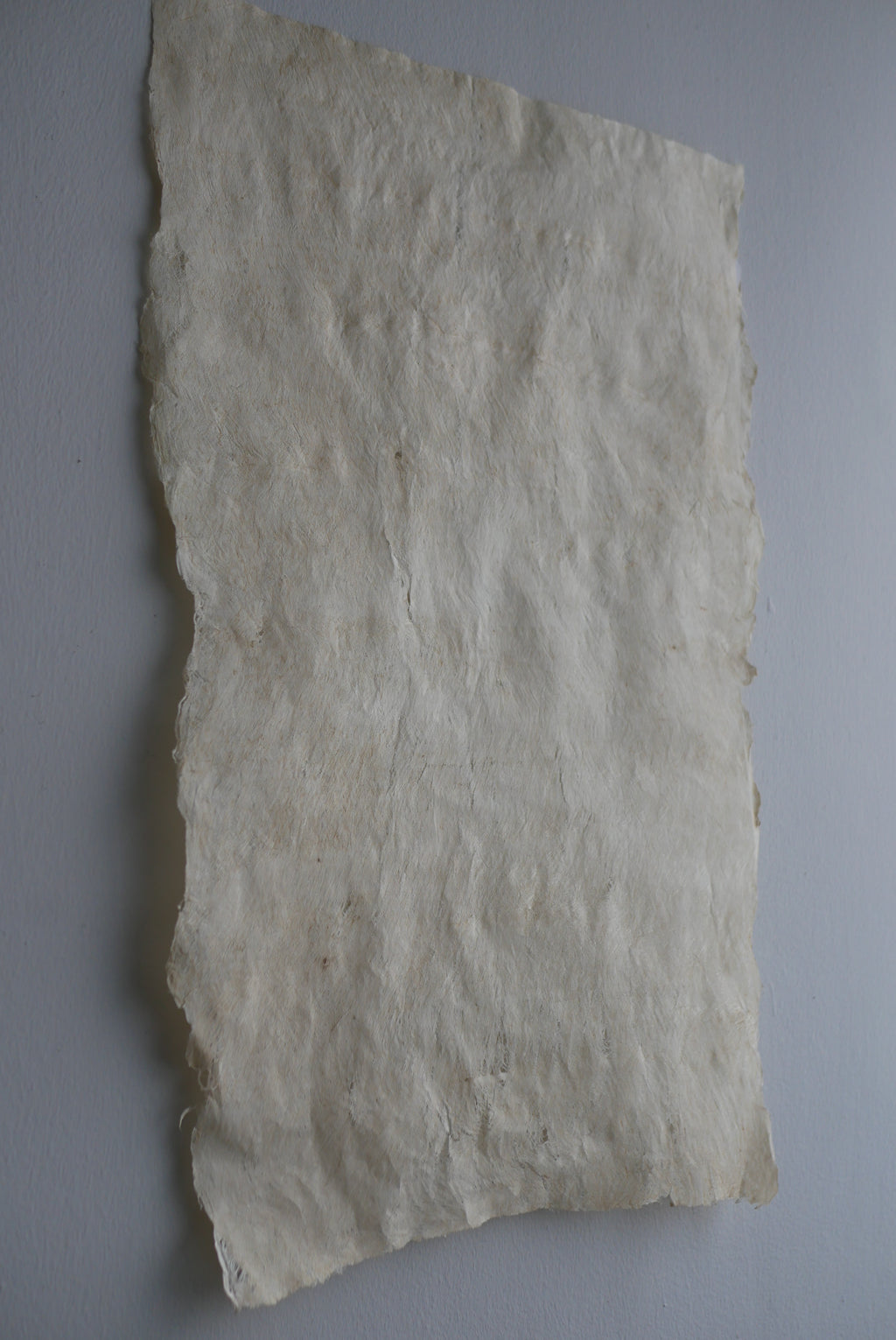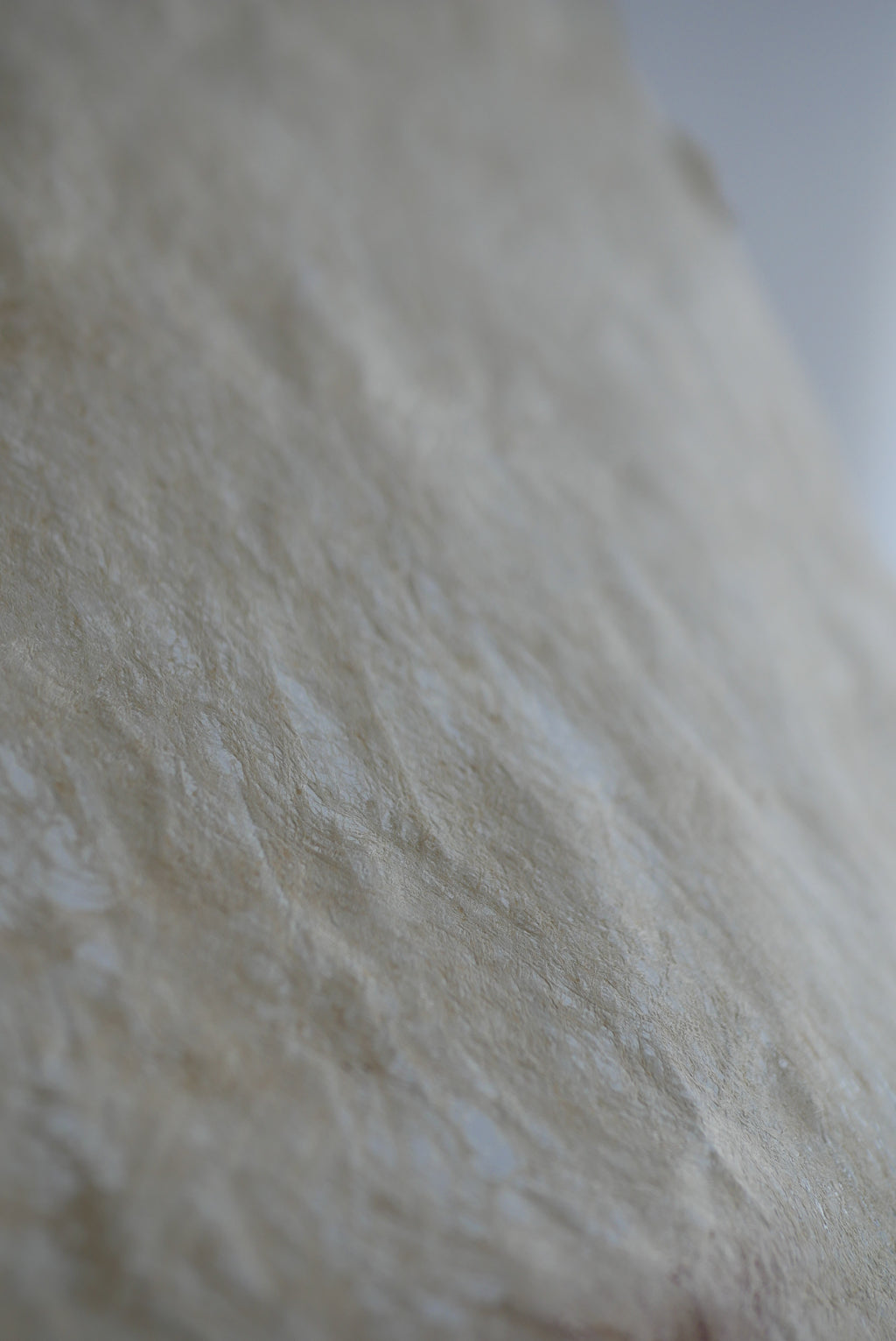 紙か布か、区別なく素材に触れ続ける。叩き、のばし、ひらくという単純な行為を重ねながら、境界をつくらず素材がもつ力そのものがあらわれる形を探究している。