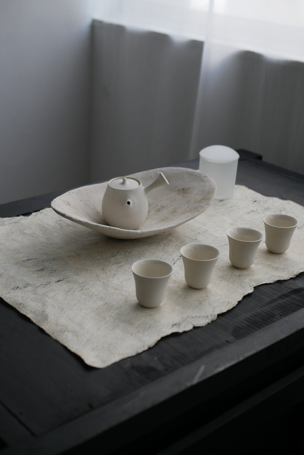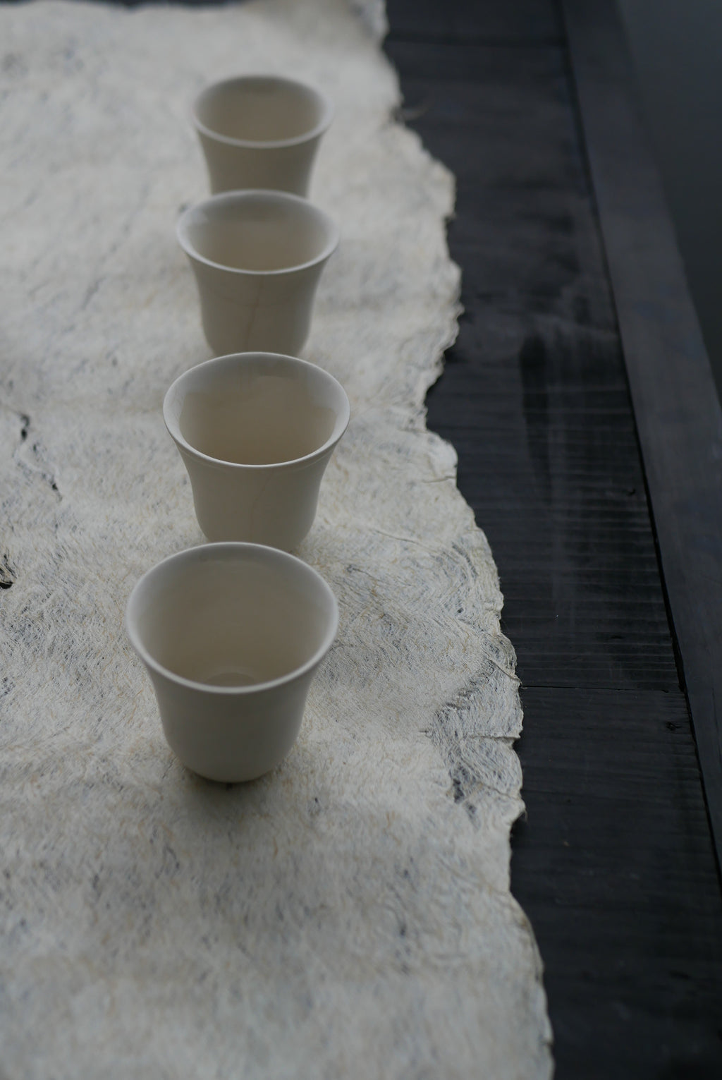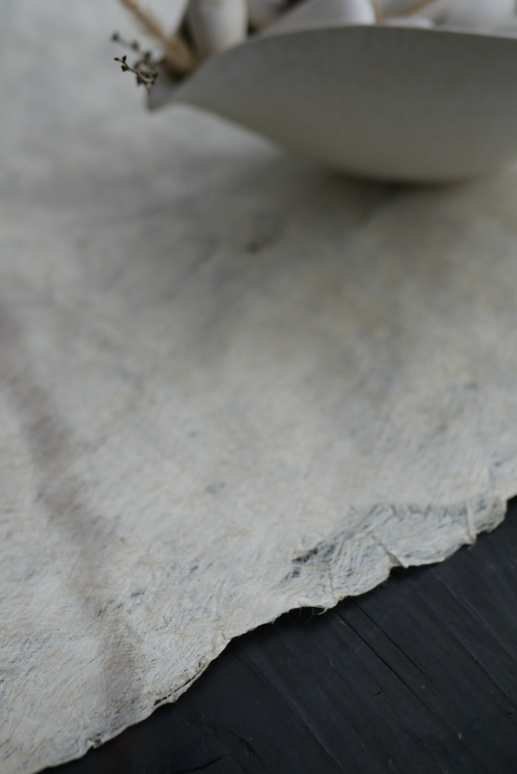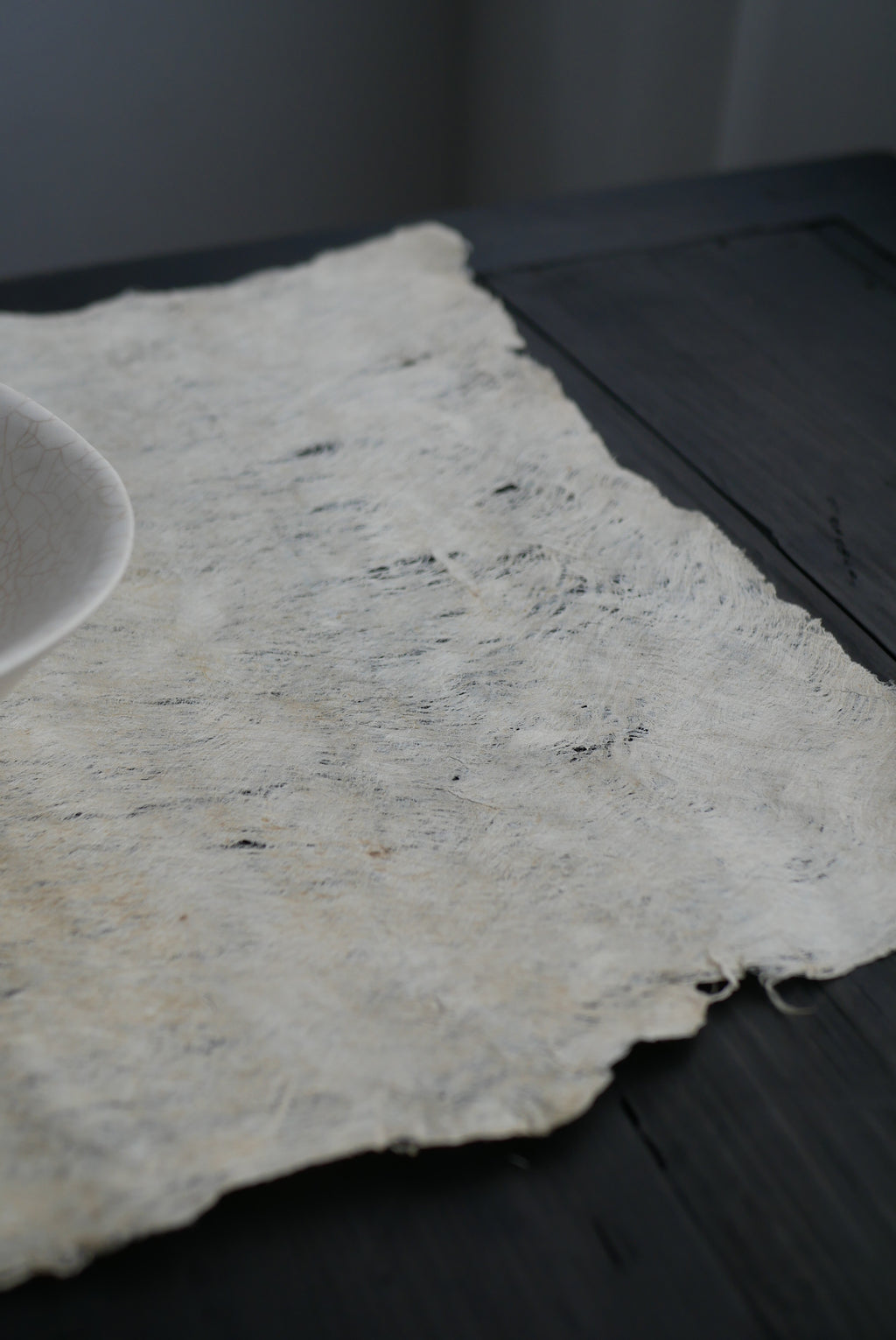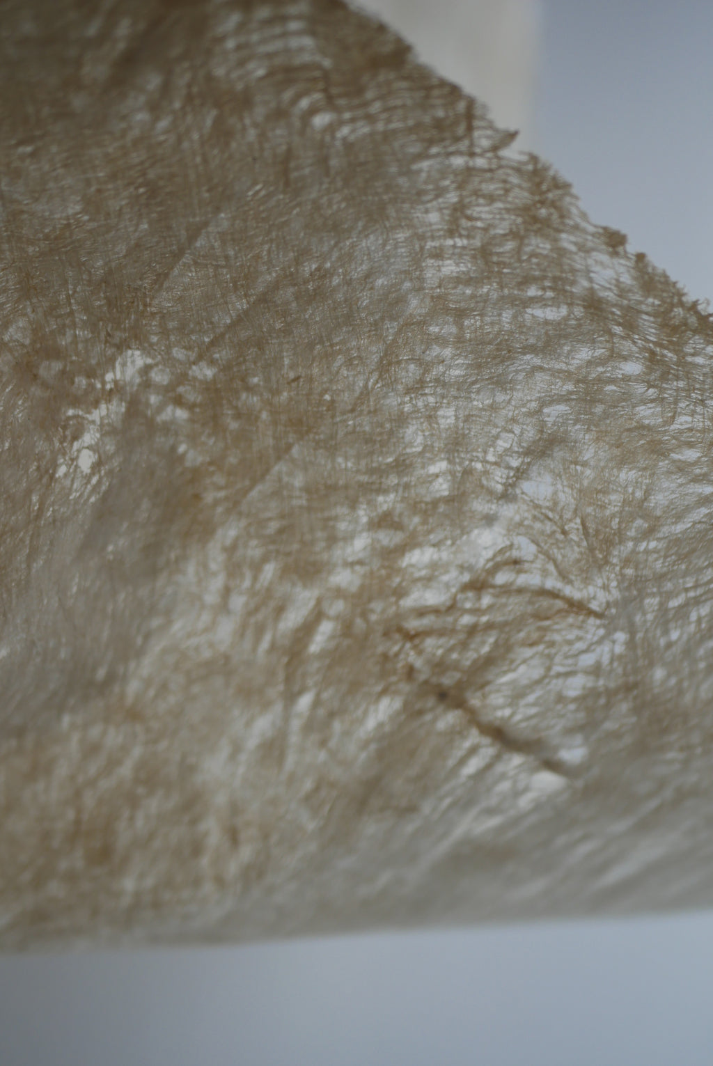 和紙の主原料である楮を用い、ひたすらに叩いてのばすことで布にしています。この布とも紙とも呼べる素材は、薄さに対して強く、ハリコシがあり、うっすらと発光するような光沢感。プリミティブと上品さを合わせもつ存在です。古物にもよく似合い、茶を嗜む方にもおすすめです。丸めて簡単に持ち運ぶこともできます。密度や長さもさまざま、厚みのあるものは手洗いが可能です。