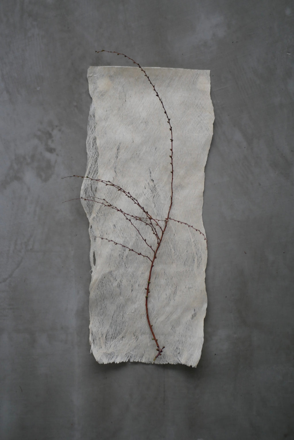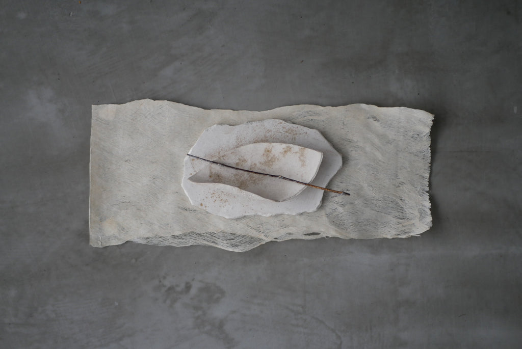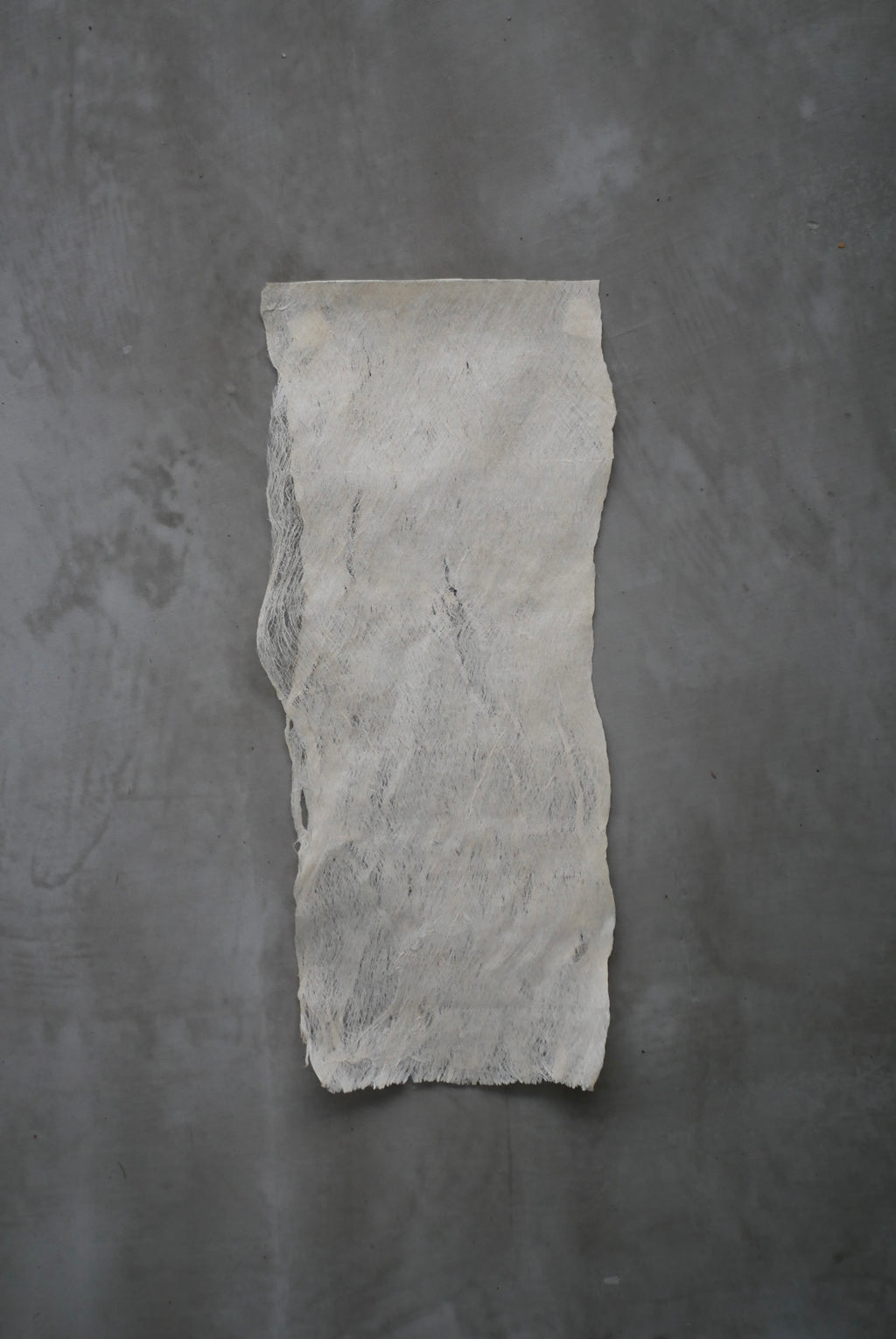 紙か布か、区別なく素材に触れ続ける。叩き、のばし、ひらくという単純な行為を重ねながら、境界をつくらず素材がもつ力そのものがあらわれる形を探究している。