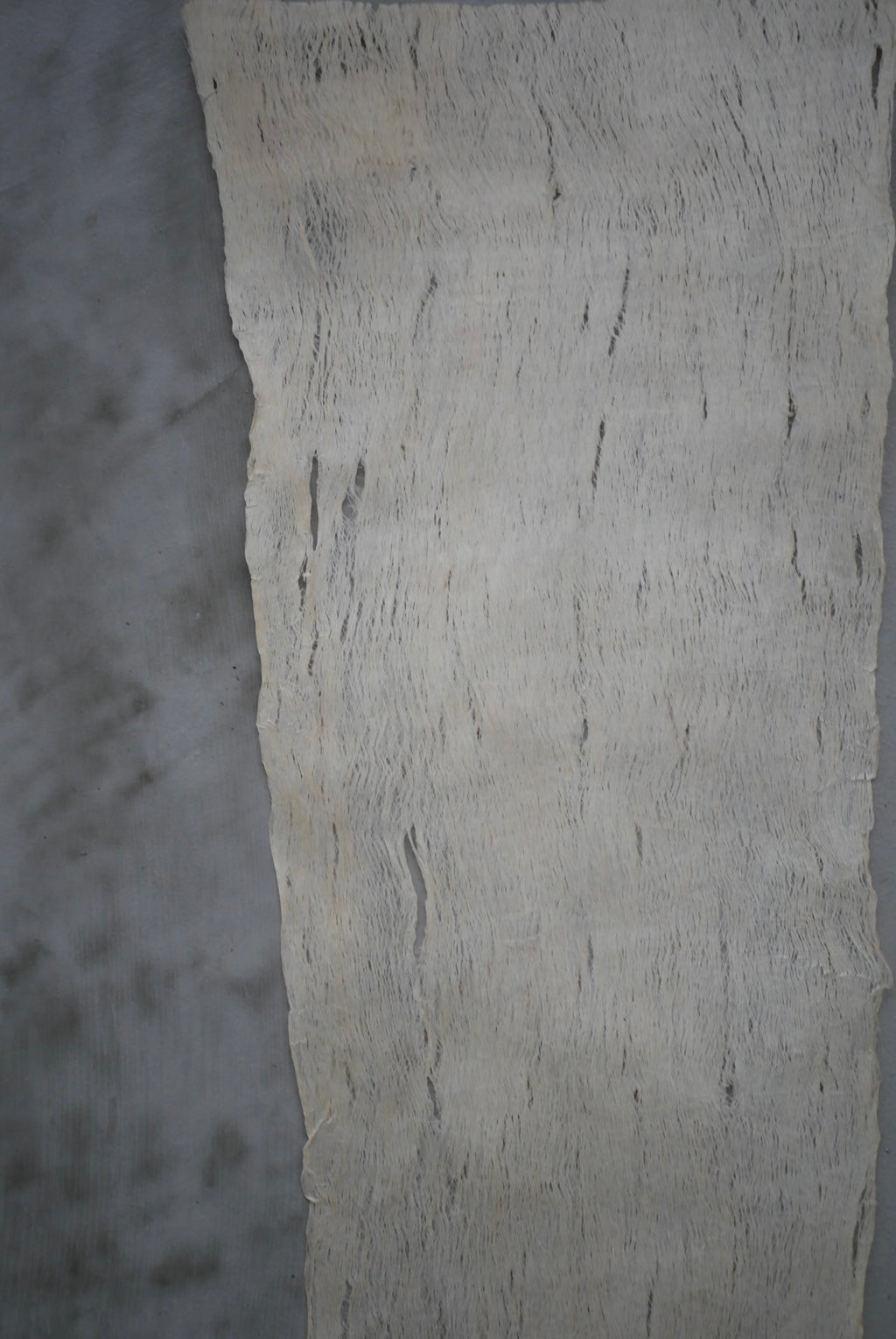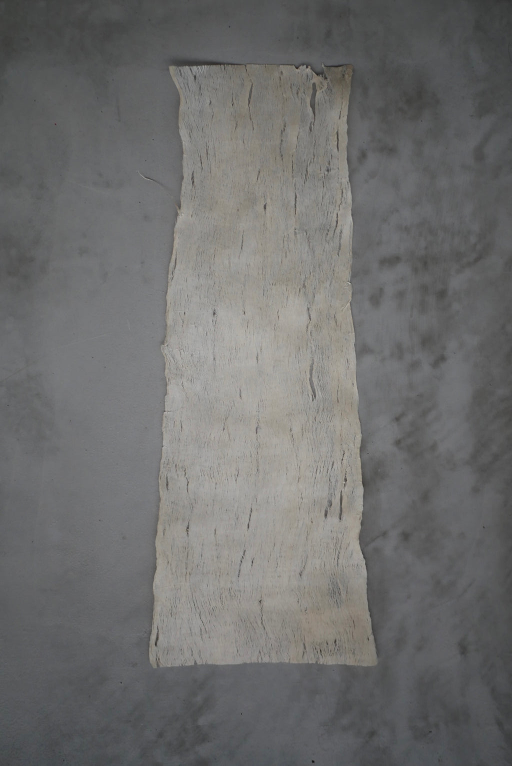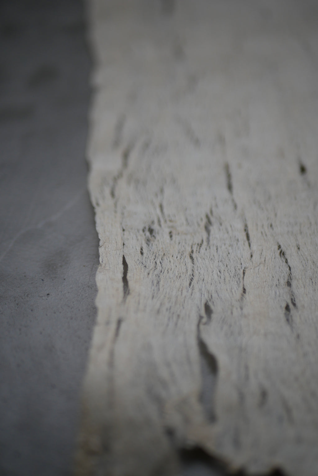 和紙の主原料である楮を用い、ひたすらに叩いてのばすことで布にしています。この布とも紙とも呼べる素材は、薄さに対して強く、ハリコシがあり、うっすらと発光するような光沢感。プリミティブと上品さを合わせもつ存在です。古物にもよく似合い、茶を嗜む方にもおすすめです。丸めて簡単に持ち運ぶこともできます。密度や長さもさまざま、厚みのあるものは手洗いが可能です。