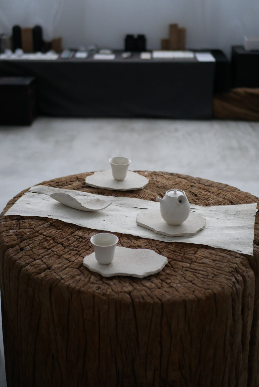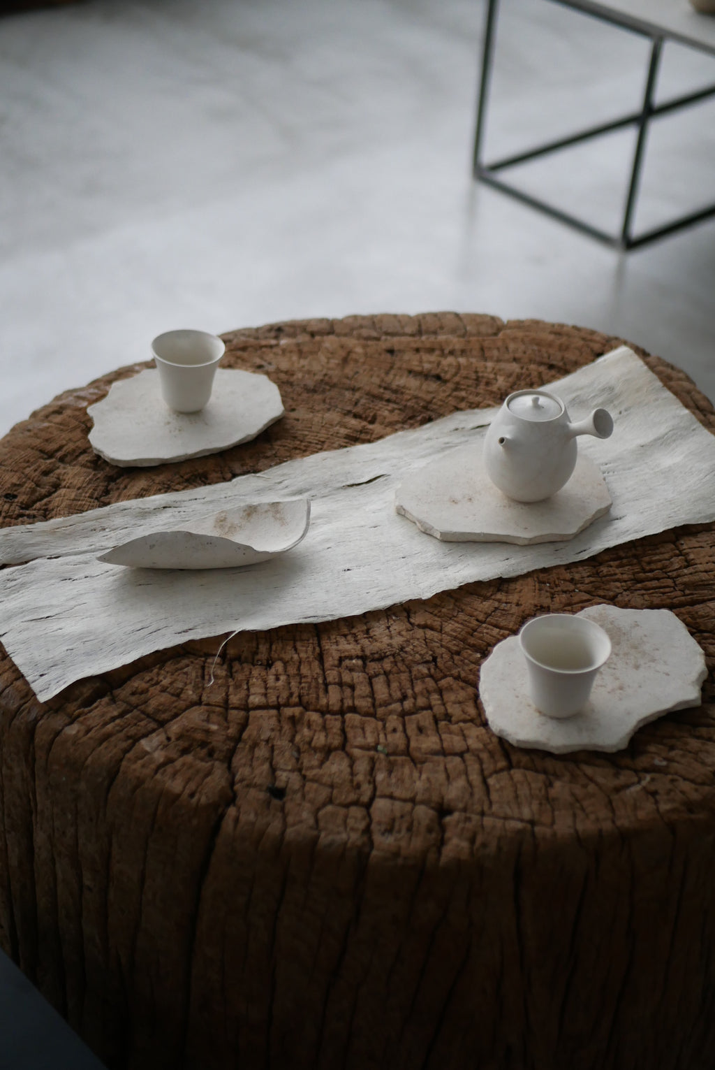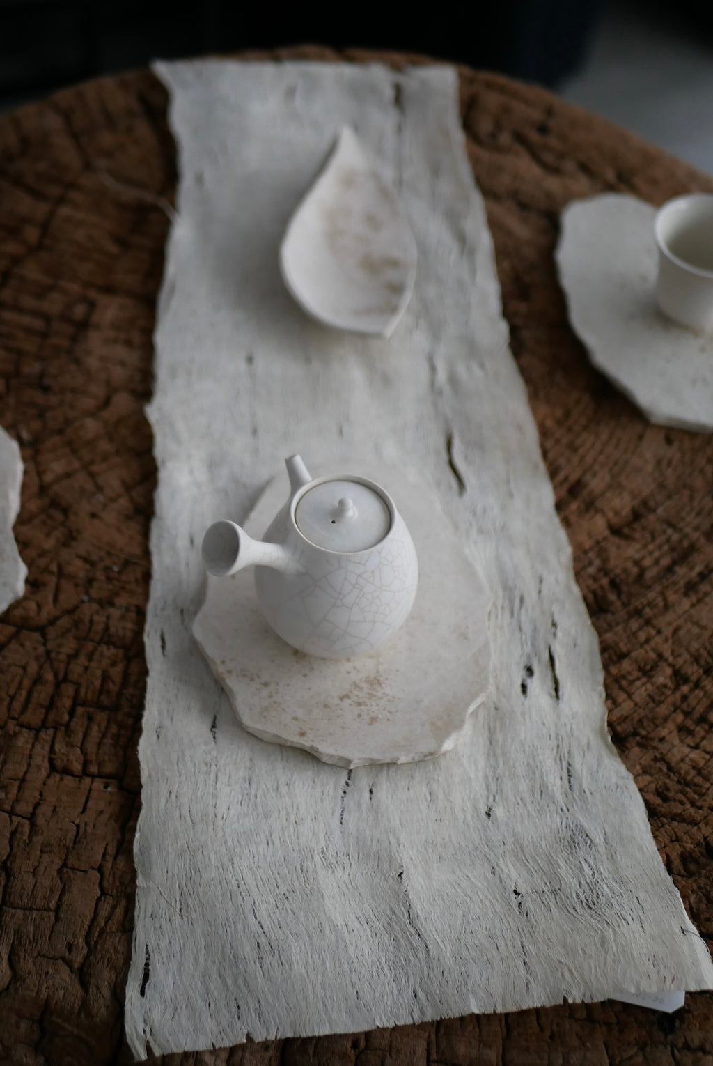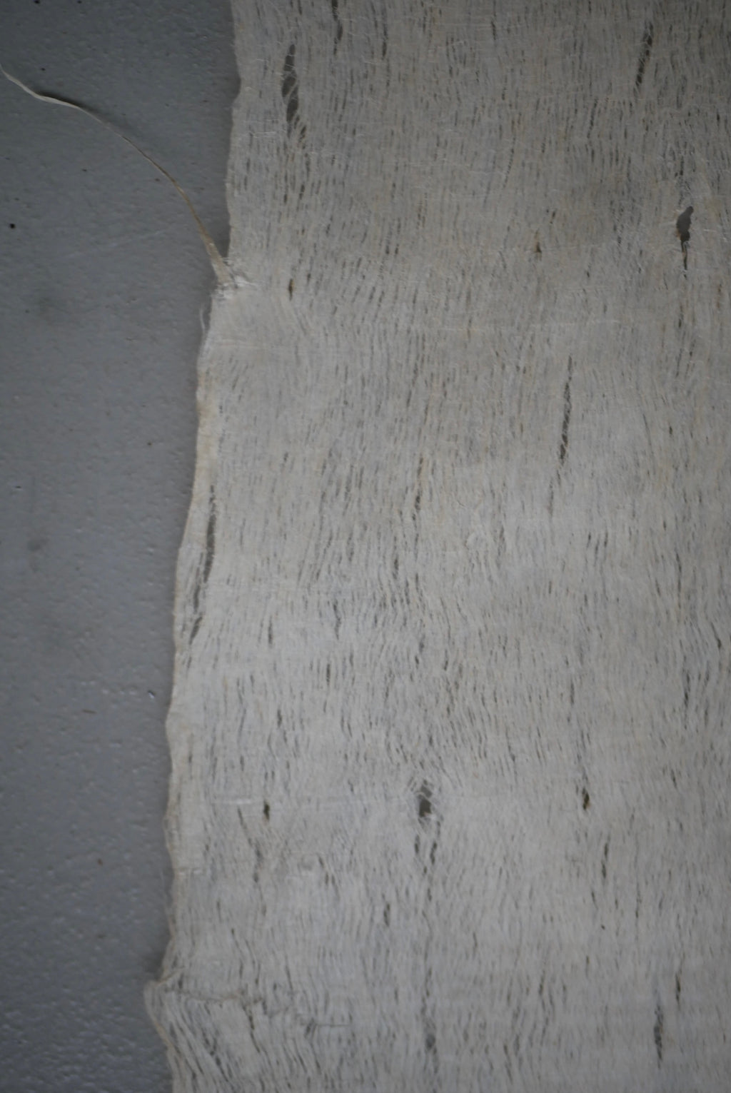 和紙の主原料である楮を用い、ひたすらに叩いてのばすことで布にしています。この布とも紙とも呼べる素材は、薄さに対して強く、ハリコシがあり、うっすらと発光するような光沢感。プリミティブと上品さを合わせもつ存在です。古物にもよく似合い、茶を嗜む方にもおすすめです。丸めて簡単に持ち運ぶこともできます。密度や長さもさまざま、厚みのあるものは手洗いが可能です。