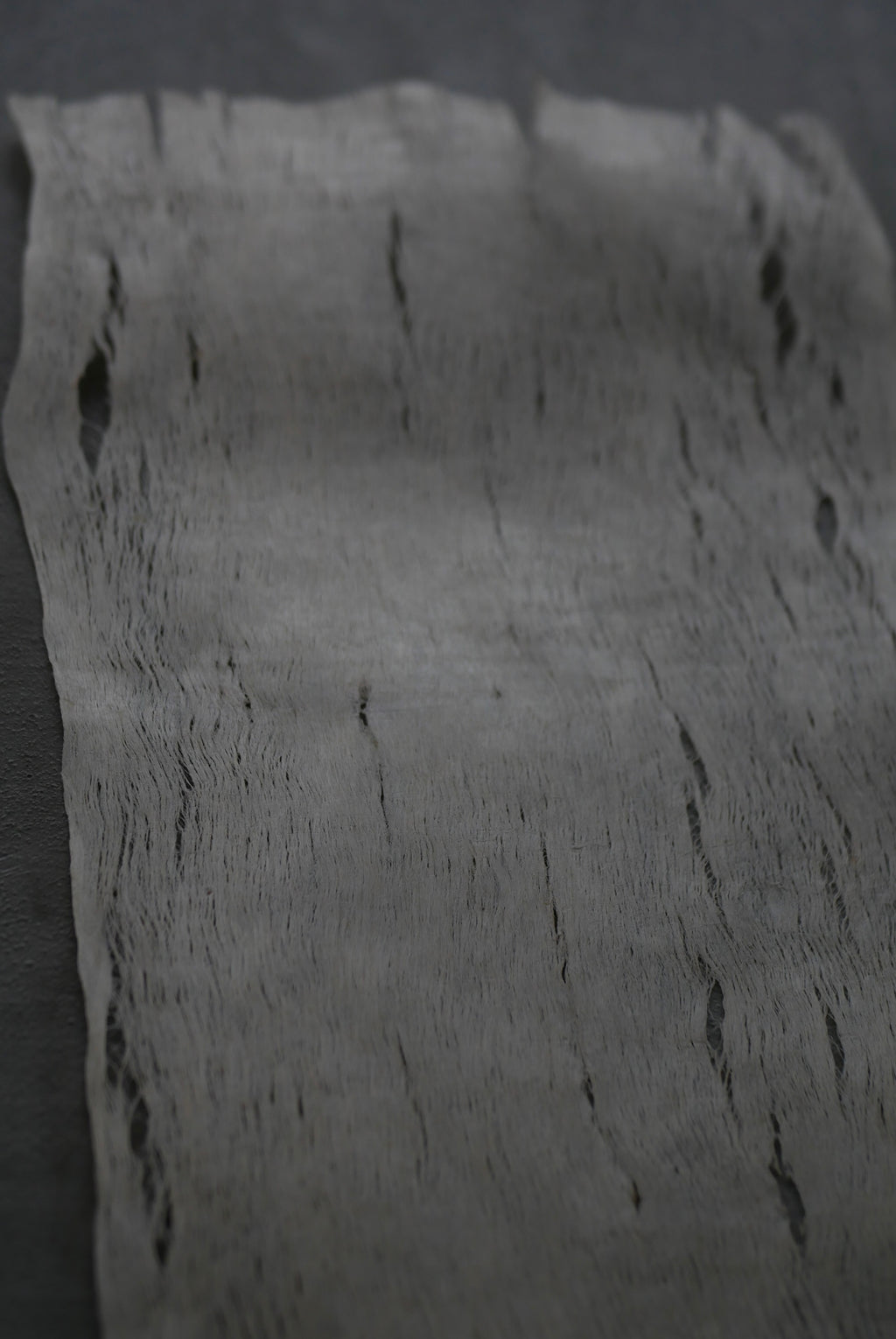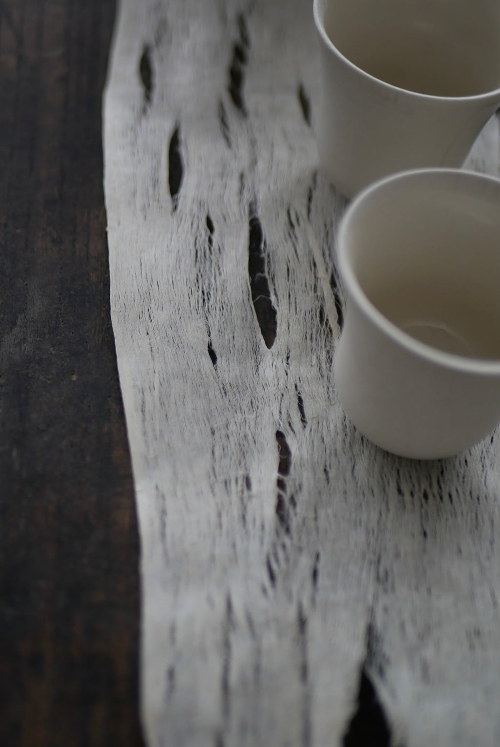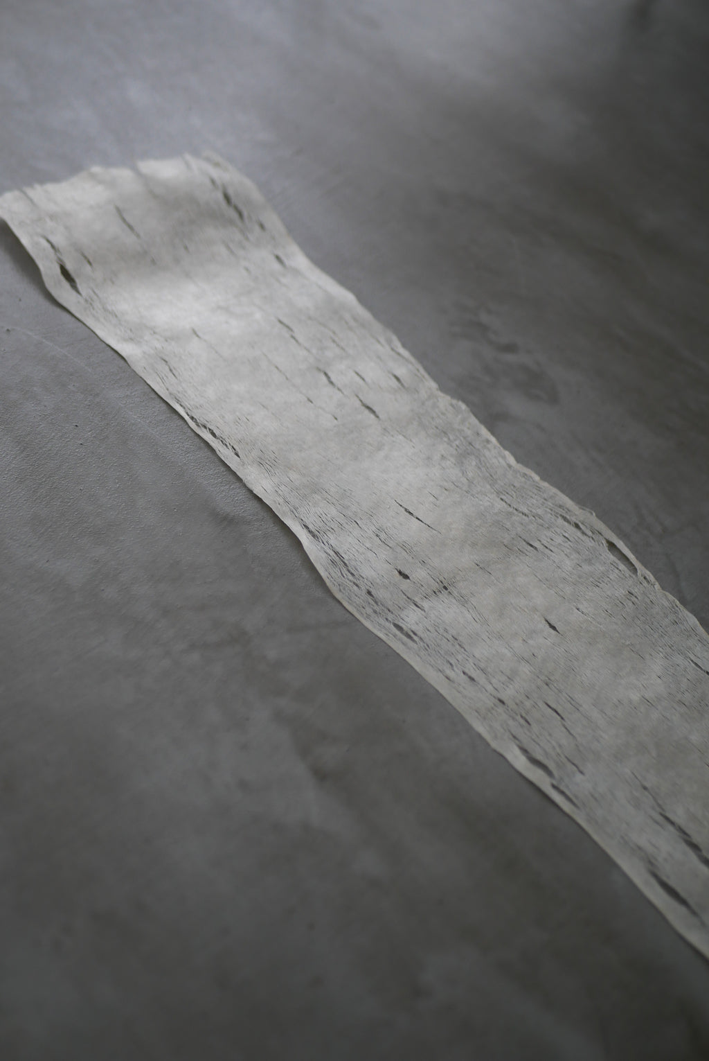 和紙の主原料である楮を用い、ひたすらに叩いてのばすことで布にしています。この布とも紙とも呼べる素材は、薄さに対して強く、ハリコシがあり、うっすらと発光するような光沢感。プリミティブと上品さを合わせもつ存在です。古物にもよく似合い、茶を嗜む方にもおすすめです。丸めて簡単に持ち運ぶこともできます。密度や長さもさまざま、厚みのあるものは手洗いが可能です。