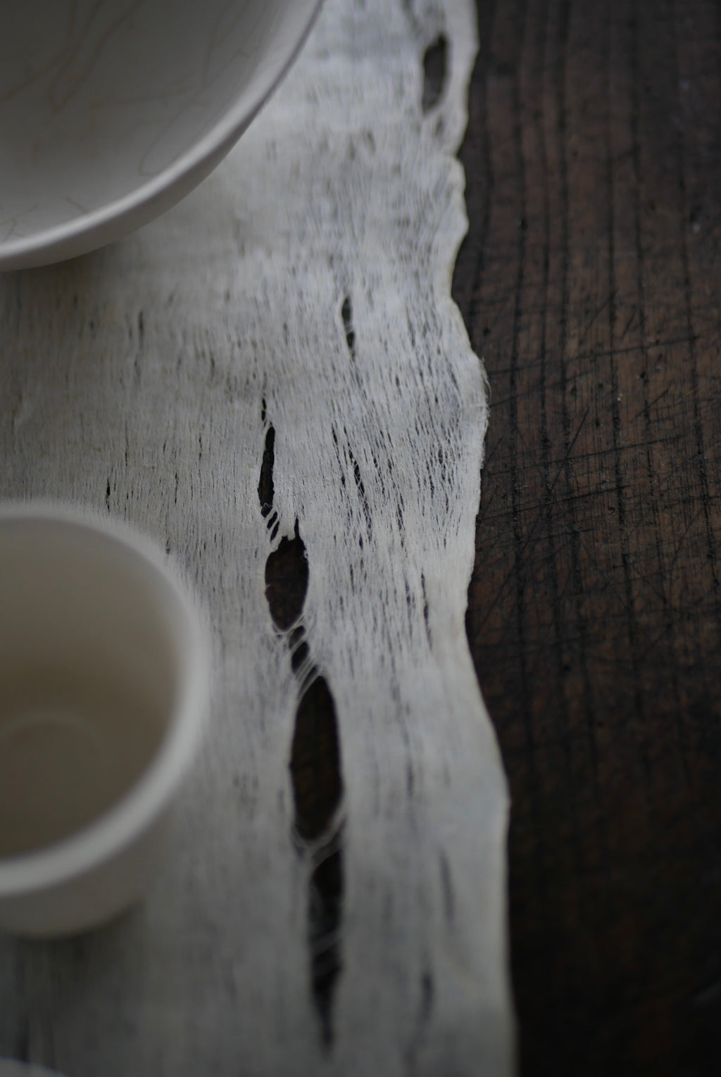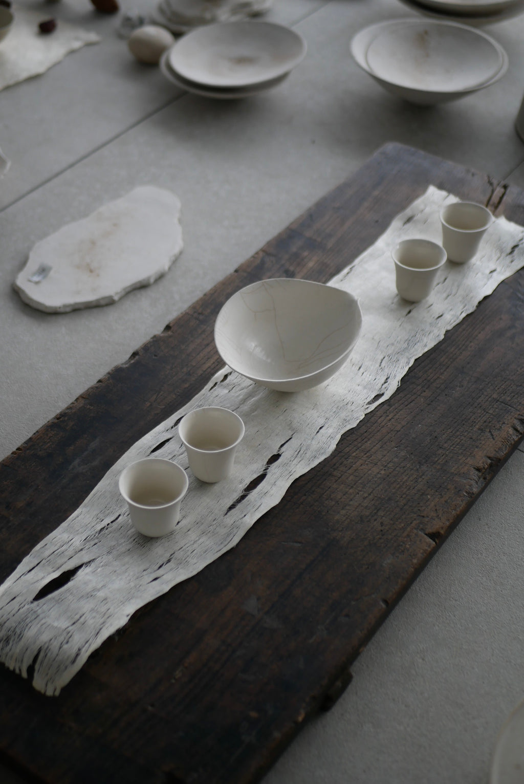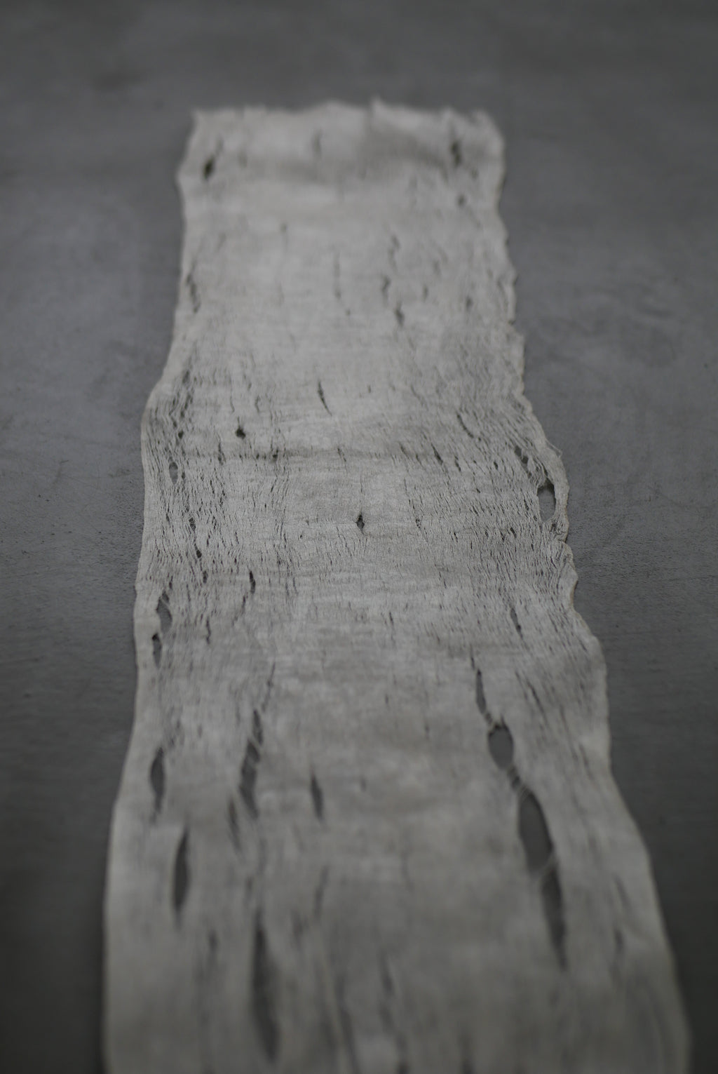 和紙の主原料である楮を用い、ひたすらに叩いてのばすことで布にしています。この布とも紙とも呼べる素材は、薄さに対して強く、ハリコシがあり、うっすらと発光するような光沢感。プリミティブと上品さを合わせもつ存在です。古物にもよく似合い、茶を嗜む方にもおすすめです。丸めて簡単に持ち運ぶこともできます。密度や長さもさまざま、厚みのあるものは手洗いが可能です。