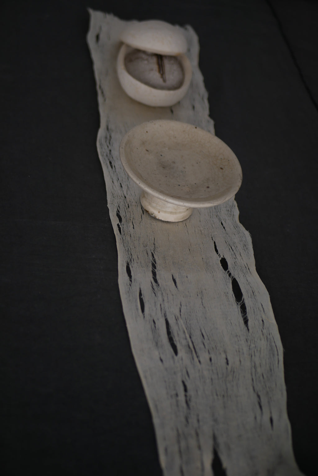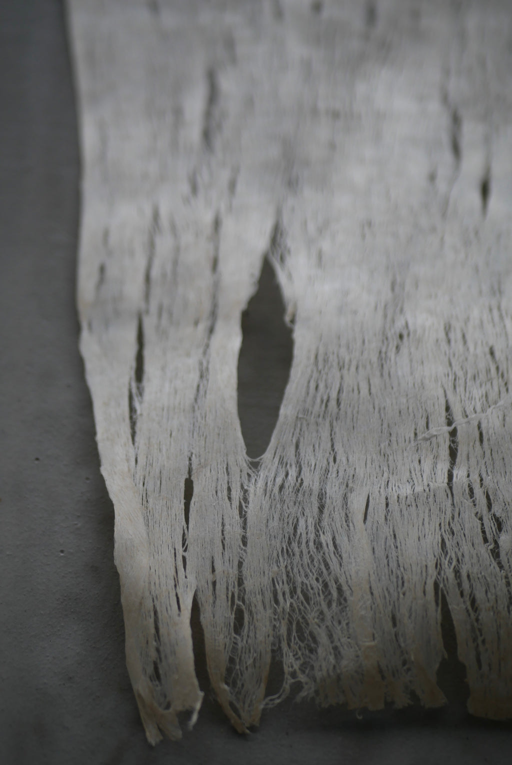 紙か布か、区別なく素材に触れ続ける。叩き、のばし、ひらくという単純な行為を重ねながら、境界をつくらず素材がもつ力そのものがあらわれる形を探究している。