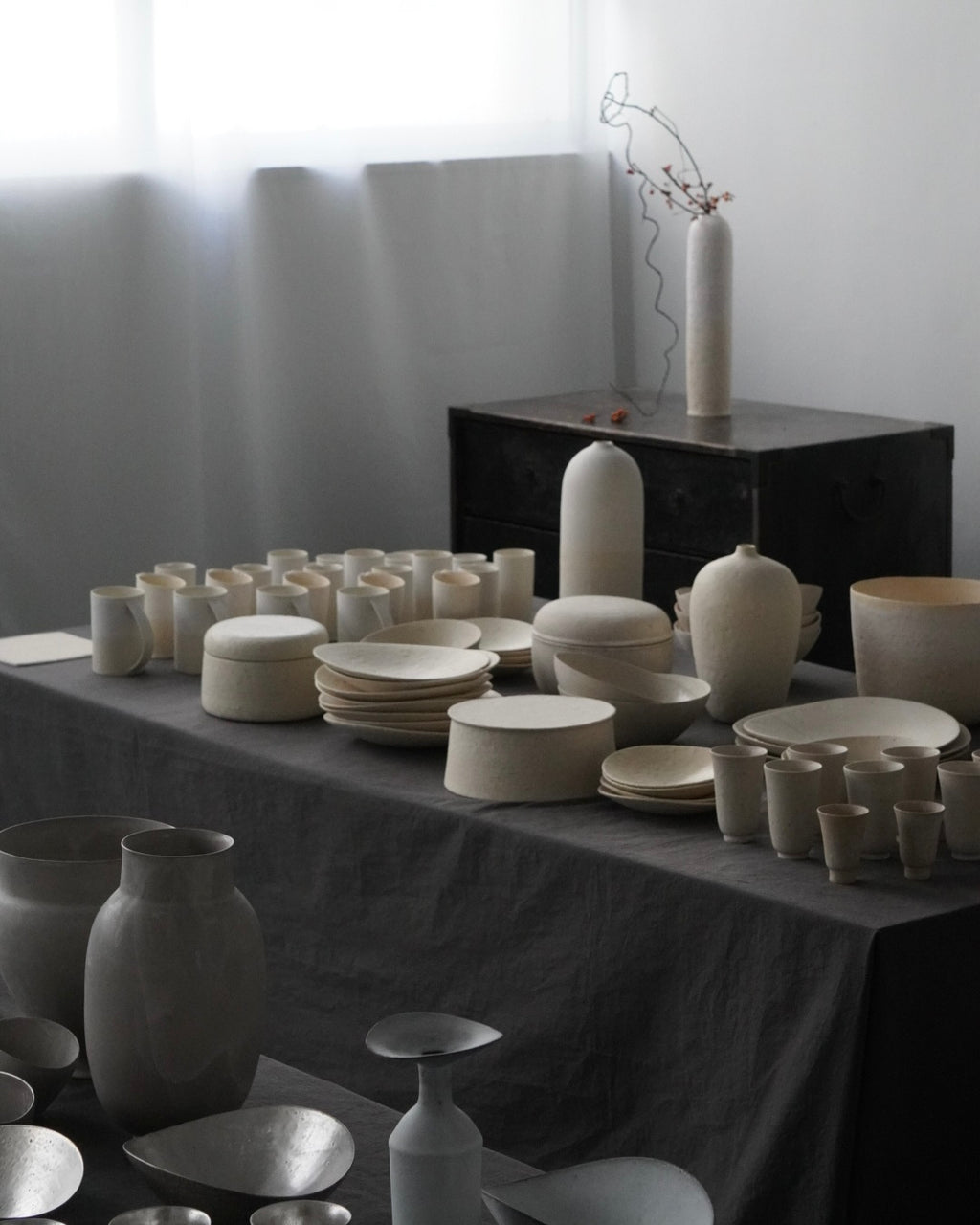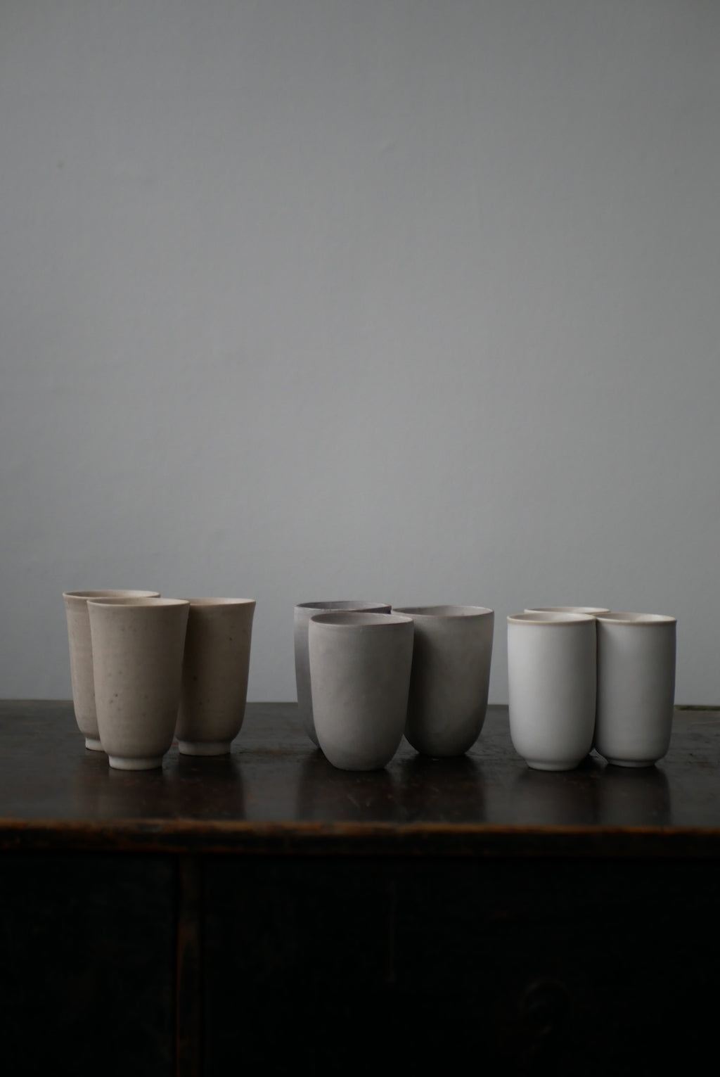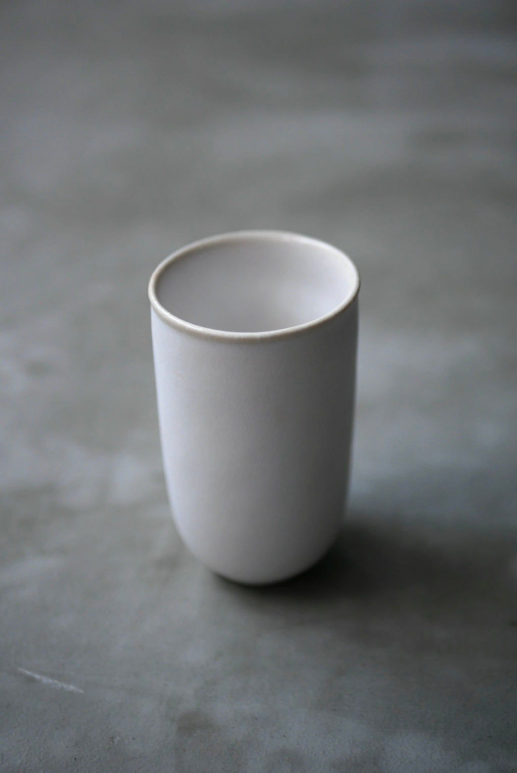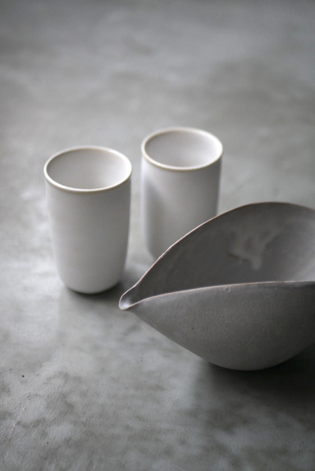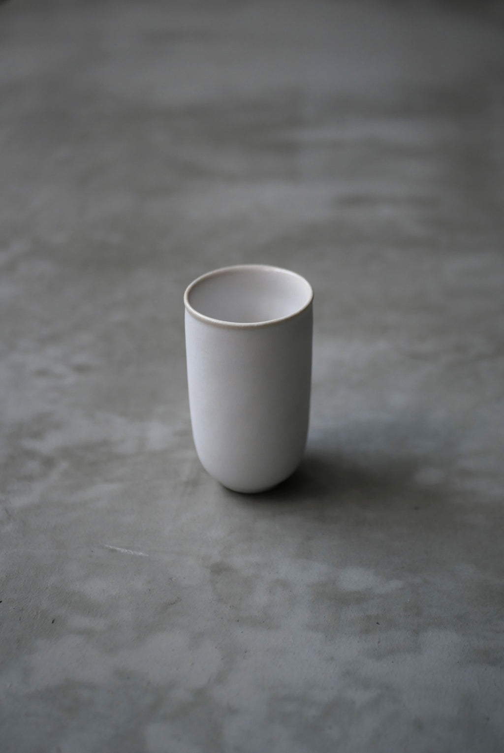 土の肌を半透明の Veil から透かして魅せるAkari  Sato の白釉。うちから発光するようなきめの細かい美しい白釉。土肌、白釉、楽焼半透明釉の三層からなる質感。釉かけ分けは半分の層にのみ白釉をかけ、下半分は土肌のぞかせており、ミニマルながらあたたかさの感じる表情。アート性の高い質感表現でありながら余白があり、花も食物も映える。