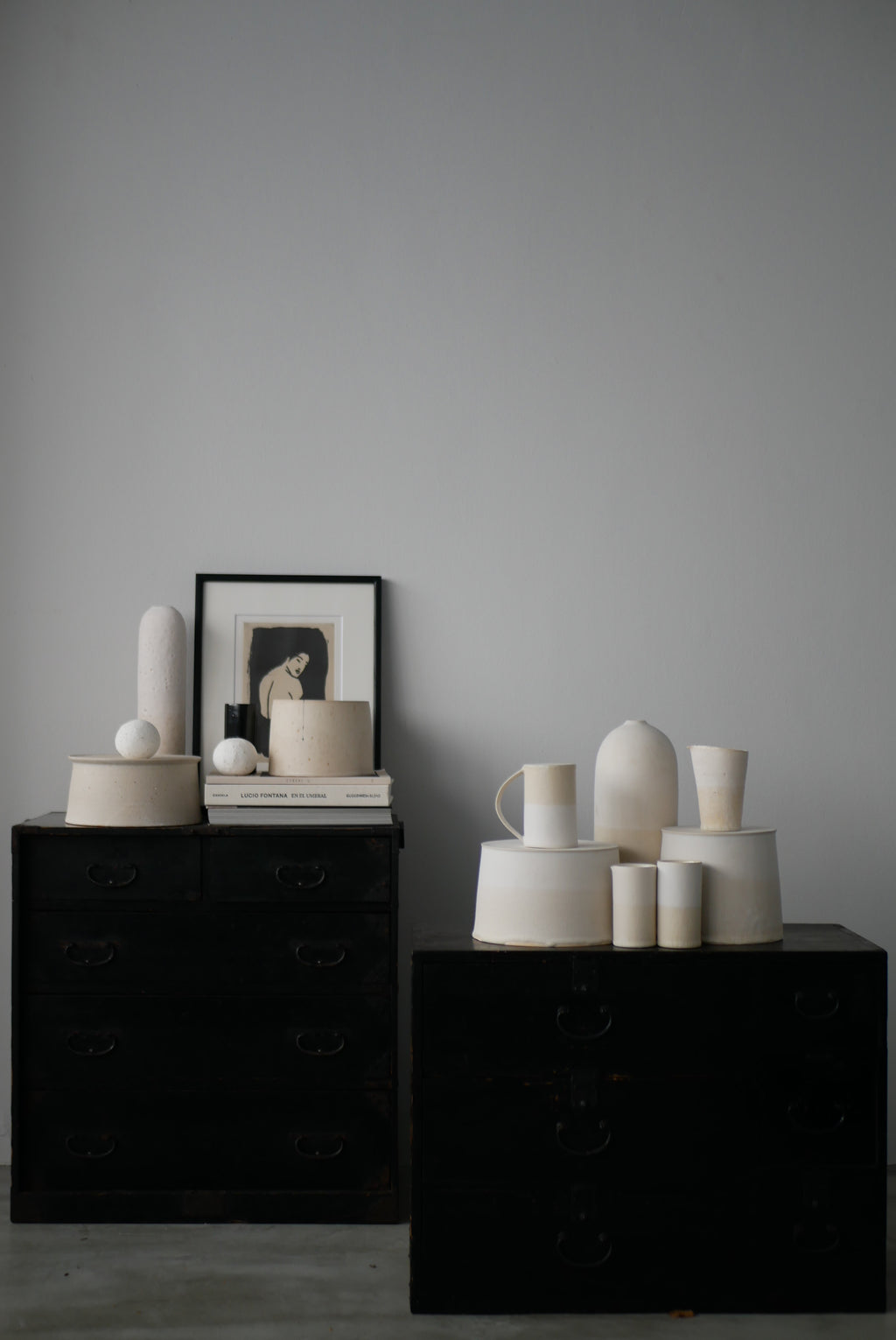 土の肌を半透明の Veil から透かして魅せるAkari Sato を代表するシリーズ。土の鉄分による模様を楽焼き Veil から透かした土肌、素土の表情や鉄分の景色に呼応して線を描くドローイング、石粒入った土をあえて用いた月面のような石肌。どれもアート性の高い質感表現でありながら余白があり、花も食物も映える。